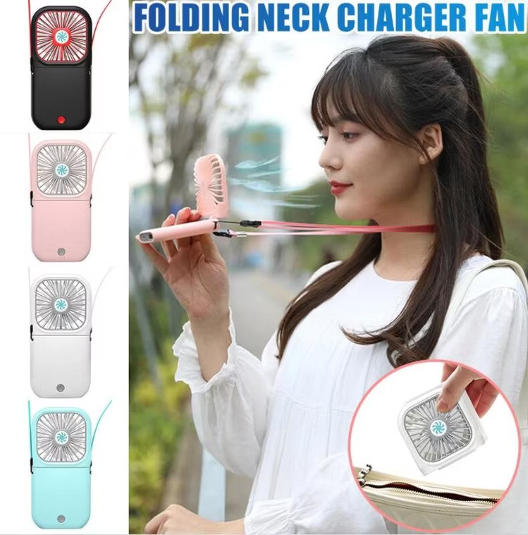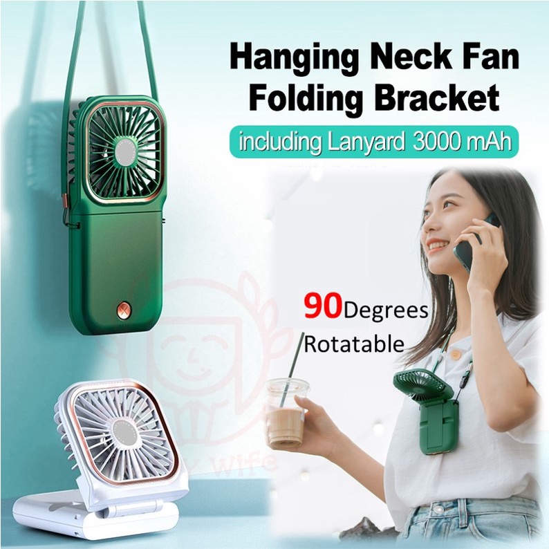 - Multifunction: Handheld, Hanging Neck and Phone Holder Desktop fan. You can hold it at hand, hang it on your neck with a lanyard (included),frees your hand when you need to hold a phone and other stuff. Besides, you can also fold it and put on the table as a desk fan, with a rotation of 180 degree